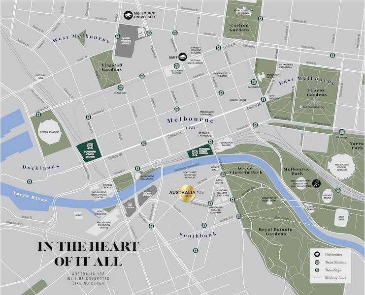 Australia 108 là toà nhà phức hợp Dân cư - Dịch vụ - Khách sạn cao nhất nước Úc và cao nhất Nam bán cầu - với độ cao 108 tầng. Dự án nằm tại trung tâm của Melbourne - gần khu giải trí, khách sạn, nhà hàng, sòng bạc Crown... và nhiều tiện ích, dịch vụ khác.